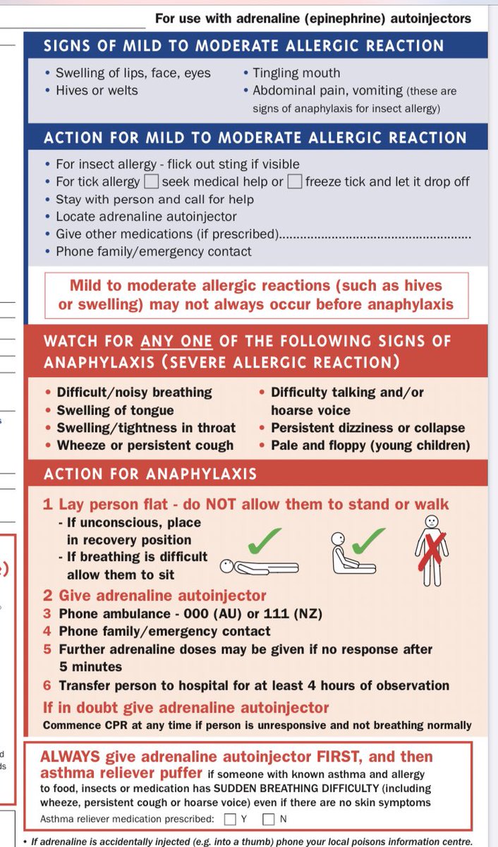 Can you provide an anaphylaxis action plan similar to the asthma action plans that are in use in you can find a link to an food allergy action plan, which includes anaphylaxis, by clicking on. Anaphylaxis action plan — patients and caregivers should be given individualized instructions about how to proceed if symptoms recur. yes yes yes yes. It can occur within seconds or. Type i (anaphylaxis) type iv (contact dermatitis) stinging insects (list): This plan is should be stored with adrenaline autoinjectors in emergency medical kits. Anaphylaxis, a severe allergic reaction, is an emergency. Find information on developing an anaphylaxis action plan that includes four basic steps and additional details about anaphylaxis. People prone to anaphylaxis are advised to have an allergy action plan. Anaphylaxis usually develops suddenly and gets worse very quickly. Inject epinephrine in thigh using (check one): An anaphylactic reaction occurs when an allergen reacts with specific ige antibodies on mast cells and. For anyone managing anaphylaxis, the following organisations in relevant locations have published sample anaphylaxis action plans.